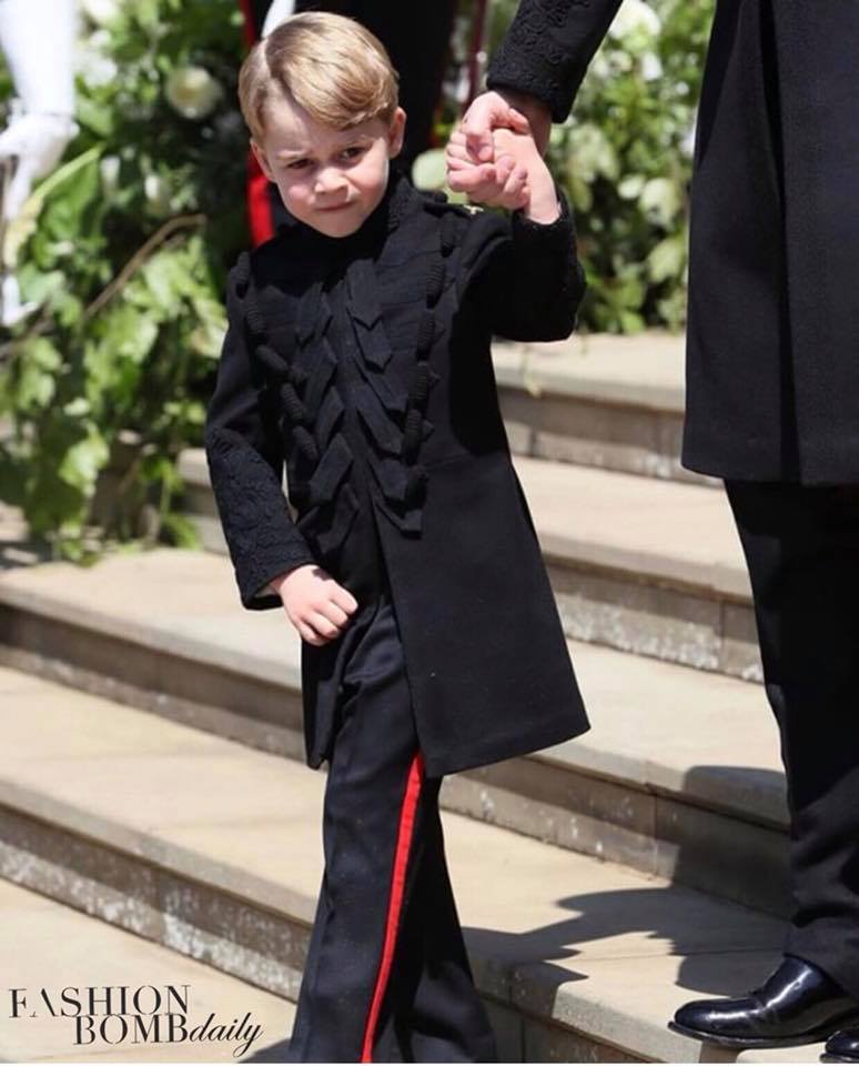 Look at this cutie! Prince George, nephew to the groom followed in his Uncle’s footsteps wearing a military-inspired coat and side stripe pants by Dege & Skinner. Prince Harry’s ensemble was also designed by them for his big day.