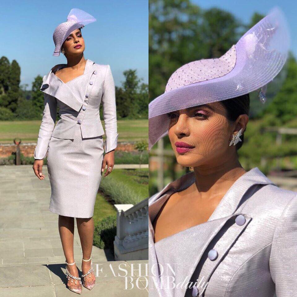 You all loved this one! Priyanka Chopra struck a sultry pose before entering her good friend’s wedding clad in a Vivienne Westwood ensemble. Do you see the asymmetrical buttoning on that jacket?! She also wore a structured lilac hat to match her skirt suit, while topping her look off with a pink lippie. Hot!
