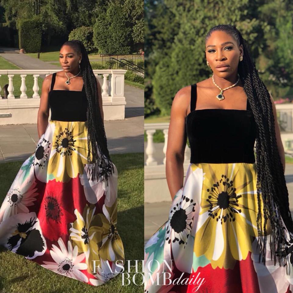Shortly after the lovely couple tied the knot at the castle, their guests gathered for a fab reception. Serena Williams was a stunner in a Maison Valentino gown designed with a vibrant floral bottom with pockets and a velvet top. Serena has been killing all of these ceremonial looks!