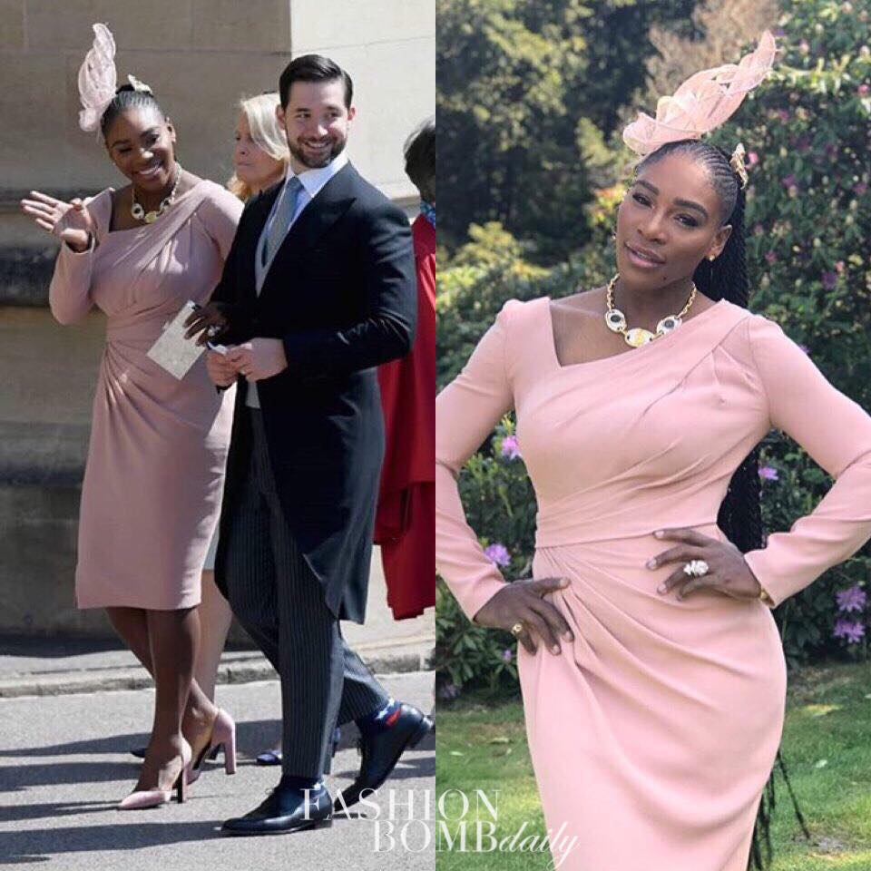 Serena Williams made an entrance with her husband to the wedding wearing a light pink Versace draped dress and a headpiece arrangement. Underneath the piece she rocked cornrows that flowed down her back, giving braids an entire new look. Her snapback is amazing, look at that waist!