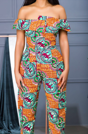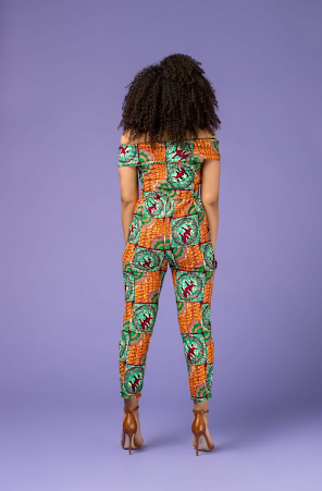 Crafted from a beautiful African print “Kadoma” material this snazzy jumpsuit features a discrete pocket design along with chic off the shoulder motif.