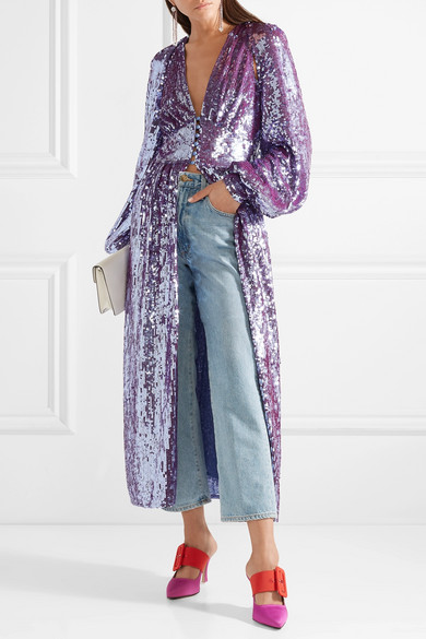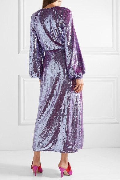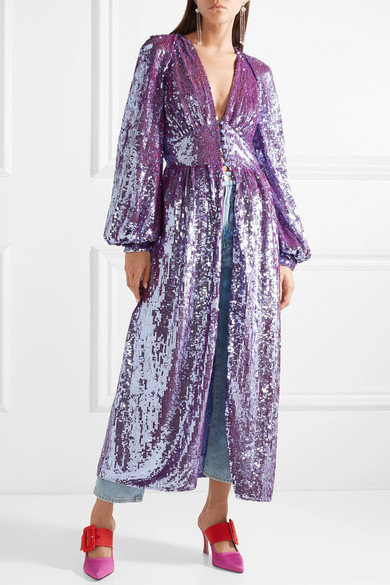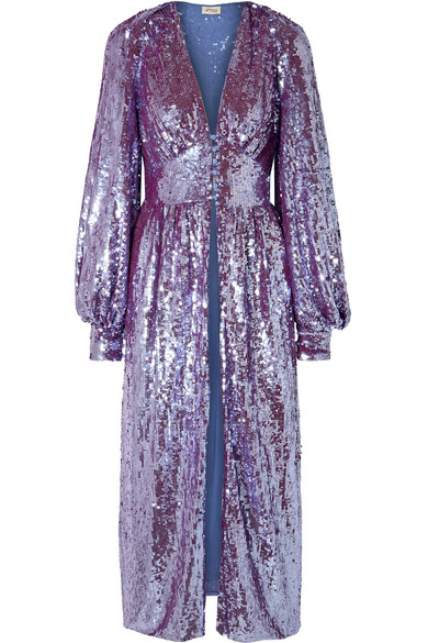 Her standout dress is crafted from tulle adorned with sequins for head-to-toe sparkle. Sliced with pear-shaped cutouts at the shoulders, this midi style has voluminous sleeves and buttoned cuffs to create a billowy shape.