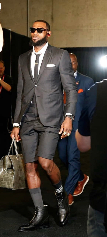 Lebron has been stepping out in style all during NBA Finals Season. For Game 1 of the final series, he looked dapper in a Thom Browne shorts suit. Who knew Mr. James could make a shorts suit look so fly?! He accessorized with a reptile printed bag and black boots. Hot!