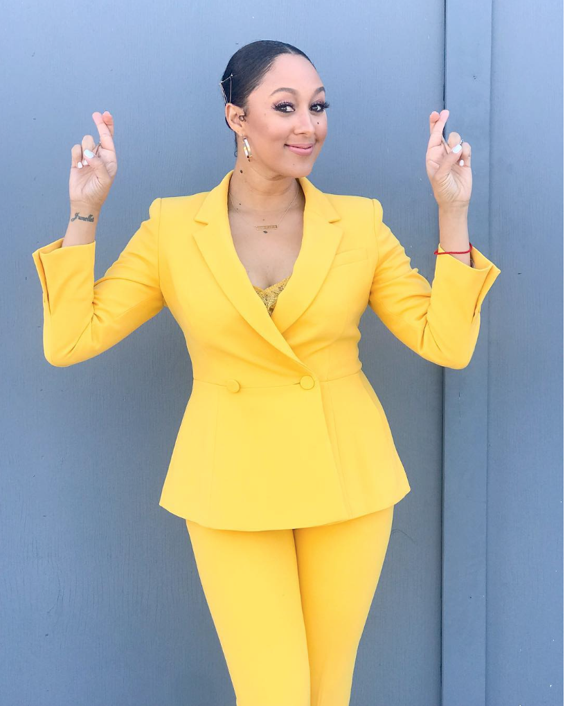 Issa steal! Tamera Mowry beamed in $150 peplum pantsuit from Zara. The yellow suit accentuates the waist with a peplum style blazer and slim leg trousers. She paired the suit with a lace yellow top that peeked through the opening of the blazer. Tamera’s sleek pulled back hair was perfect for this bright look. This is a perfect summer look for a day in the office or even a brunch. Would you rock it? Snag the blazer for $100 here, and the pants for $50 here!