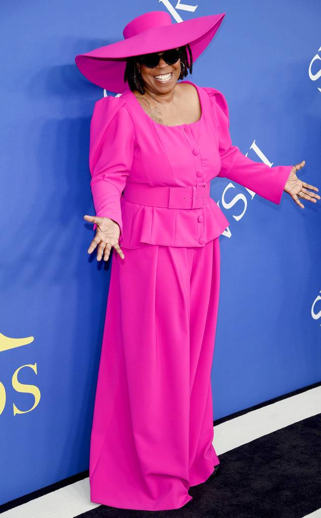 Whoopi Goldberg beamed in a hot pink Christian Siriano belted ensemble. Siriano and Whoopi are a dynamic duo when it comes to carpet looks and this outfit shows why. She topped her belted jacket and wide leg pant look off with a matching hat. Go, Whoopi!