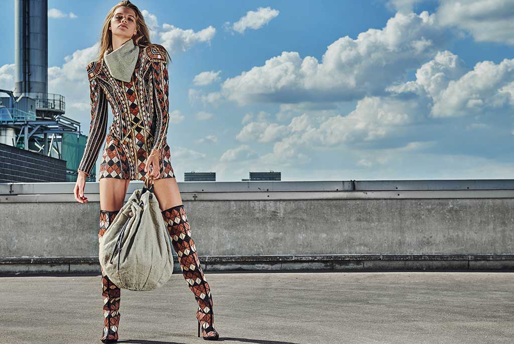 The dress and matching boots boasts a wooden like construction with cut edges throughout. Hot!