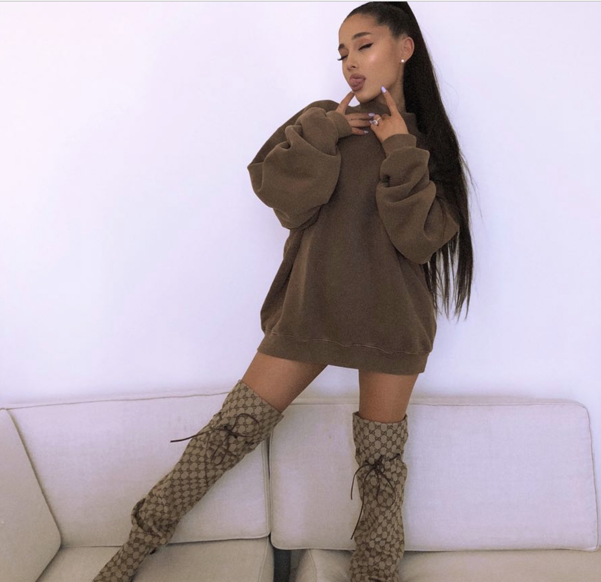Ariana Grande is the latest to rock the look, pairing the hot steppers with a cocoa hued sweater dress.