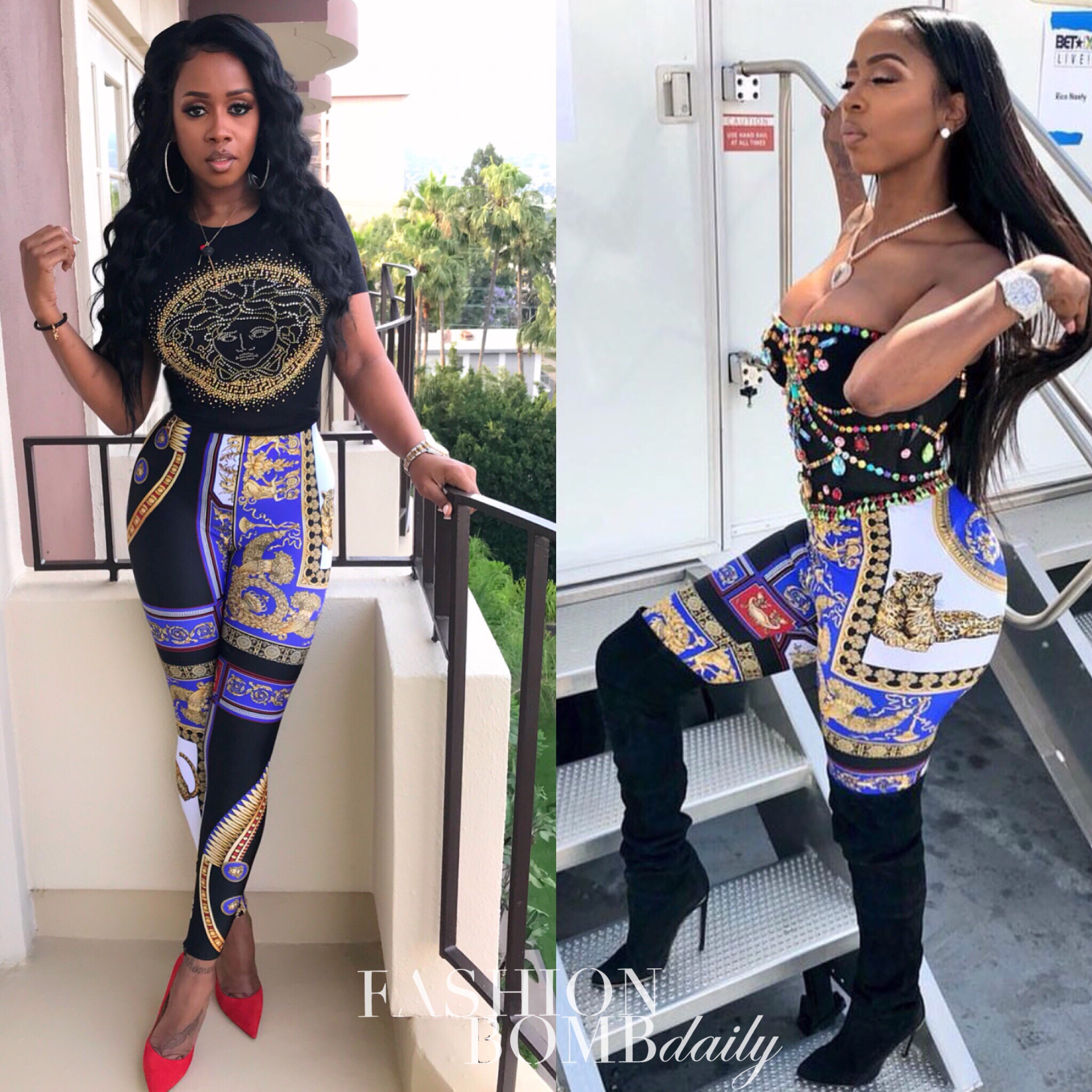 LA has been heating up all weekend leading up to the BET Awards tonight. Celebs have been slaying the streets from event to event and Remy Ma and Kash Doll happened to rock the same leggings while out in the LA streets. The $795 Versace ‘Lovers Print’ leggings are designed with baroque inspired prints and have a high-waist fit.