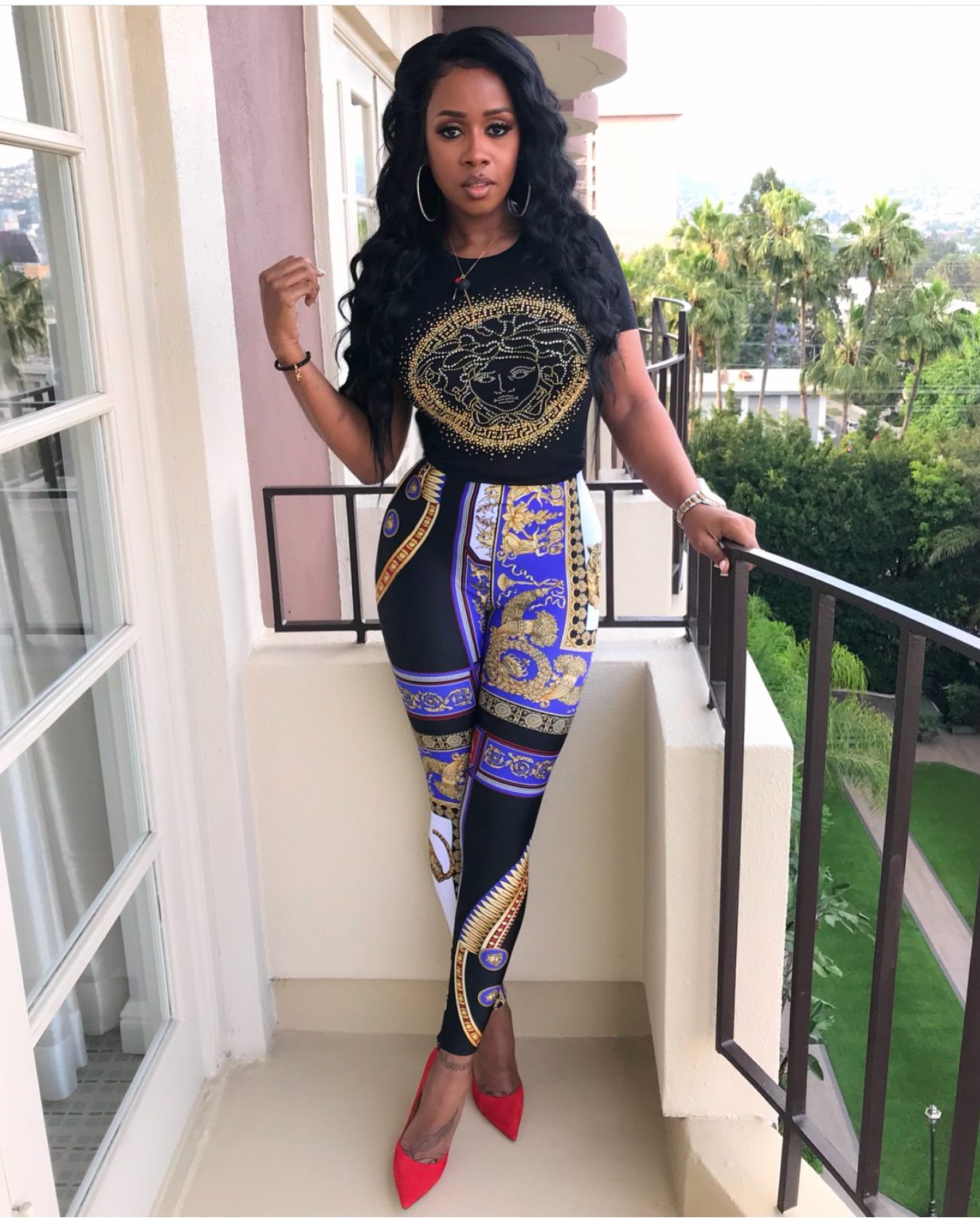 Remy went for a head-to-toe Versace look pairing a $725 Versace crystal adorned Medusa tee with her leggings. She slipped on red pumps to complete the look which brought out the tiny bit of red in the leggings.