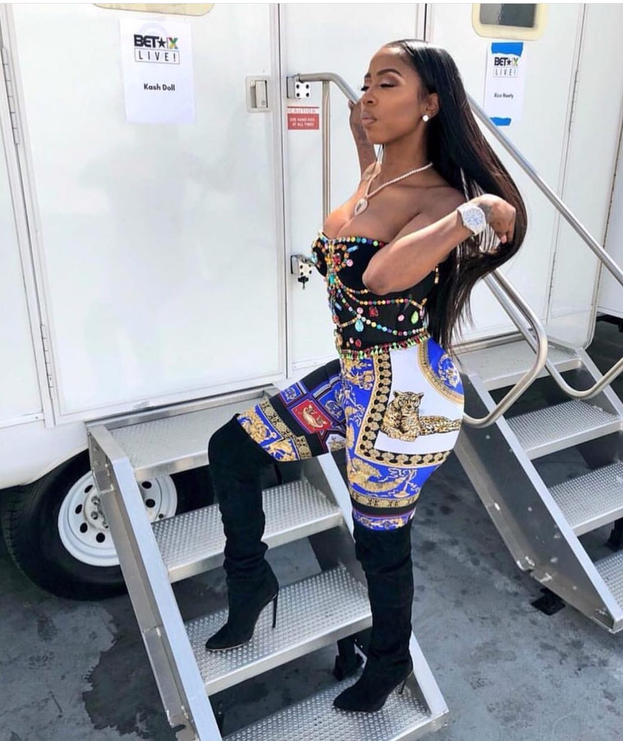 Kash Doll went for full glam before performing on the BET X stage, so her look was a bit more costume-like. She opted for a bustier festooned with colorful crystals and over-the-knee black boots.