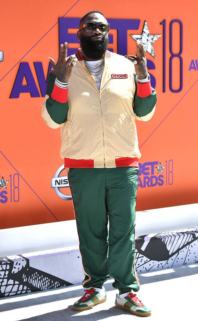 It was all Gucci for Rock Ross. The rapper was draped in Gucci from head to toe from his shades, to his track suit, to his sneakers.