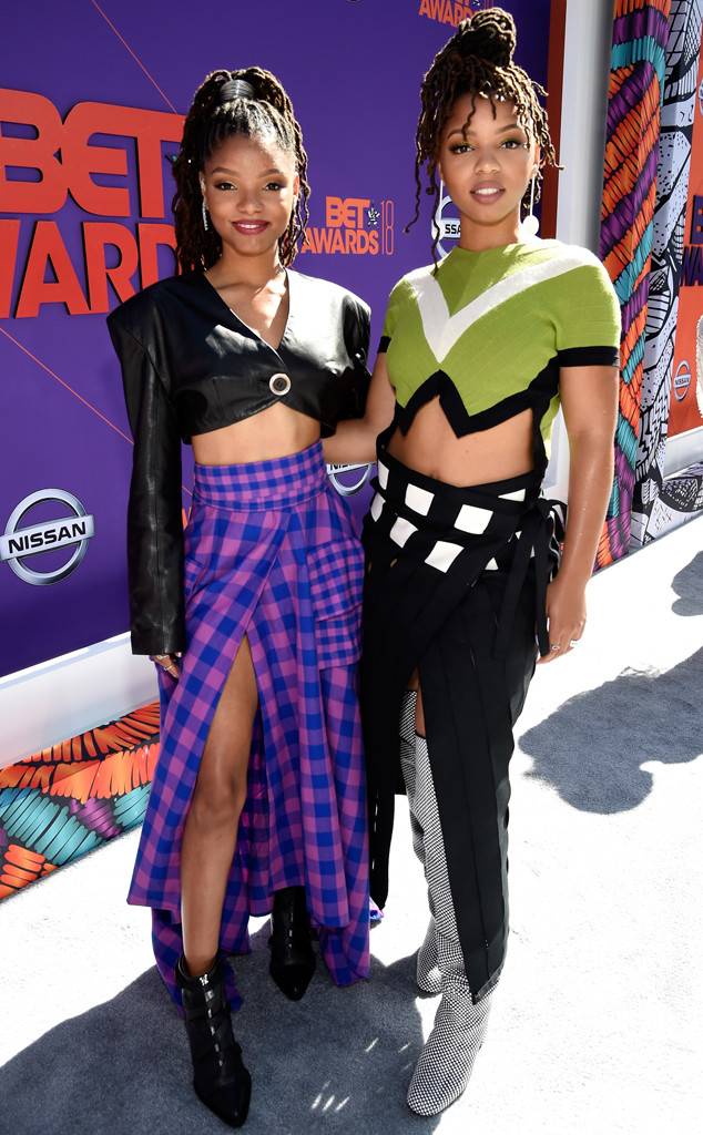 Sisters Chloe & Halle Bailey usually wear similar looks, but tonight they opted for different outfits and designers. Chloe (L) wore a cropped leather top and plaid skirt by Linder, while Hailey (R) was dressed in Natasha Zinko threads.