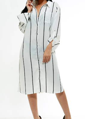 Retailing from $45 this sassy dress features a vertical striped button down design along with a polyester mix with a sleek front pocket.