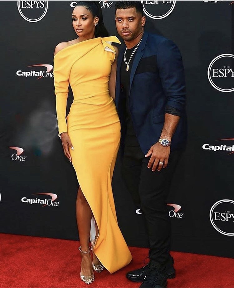 Two snaps and a twist for Ciara in this gleaming yellow gown from the Toni Maticevski Fall 2018 collection! This color popped perfect on the red carpet, and we love how the cut of this dress accented CiCi’s perfect shape.