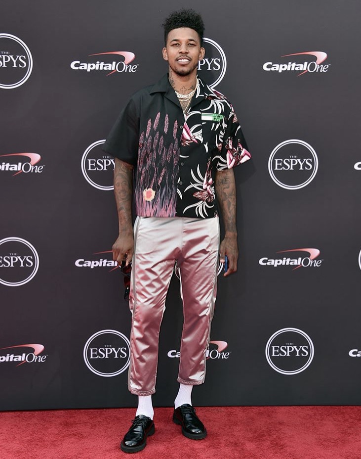 When your nickname is Swaggy P, you have no choice but to keep it fresh! Nick Young attended the Espy Awards wearing a floral print Prada top paired with ankle-length metallic pants.