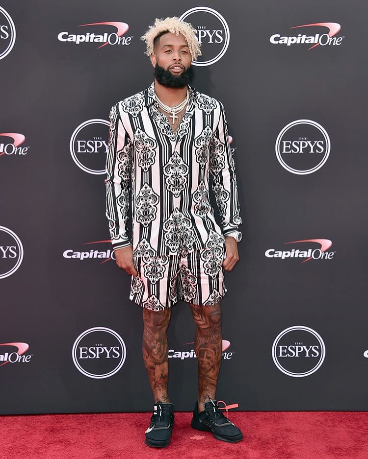 Rounding out our 2018 Espy Awards red carpet looks is Odell Beckham Jr. in this Versace short set paired with Nike x Off White sneakers.