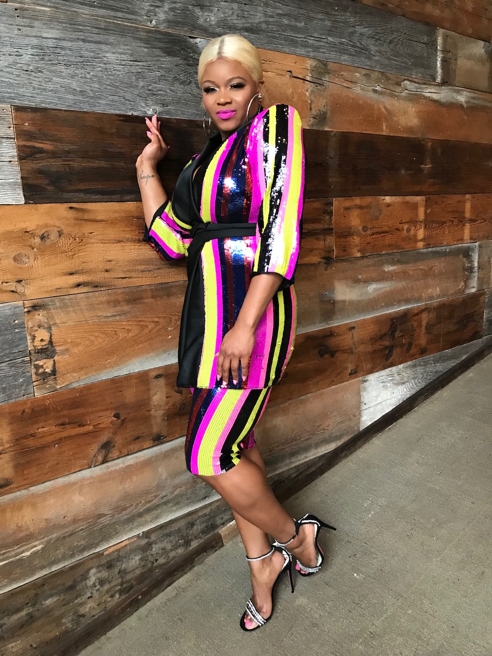 @FlightsNStilettos worked a pink bodycon dress and nude heels.