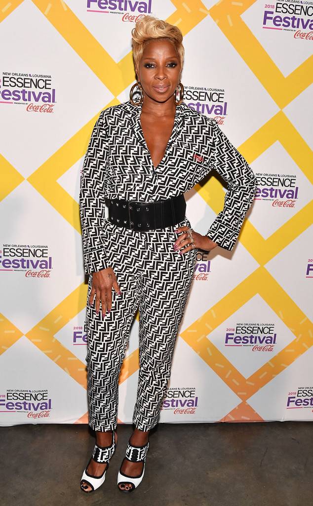 Mary attended ESSENCE Festival earlier in the summer adding her own flair to the jumpsuit. She wore a wide black belt and completed her look with matching Fendi logo print sandals and her signature hoop earrings.