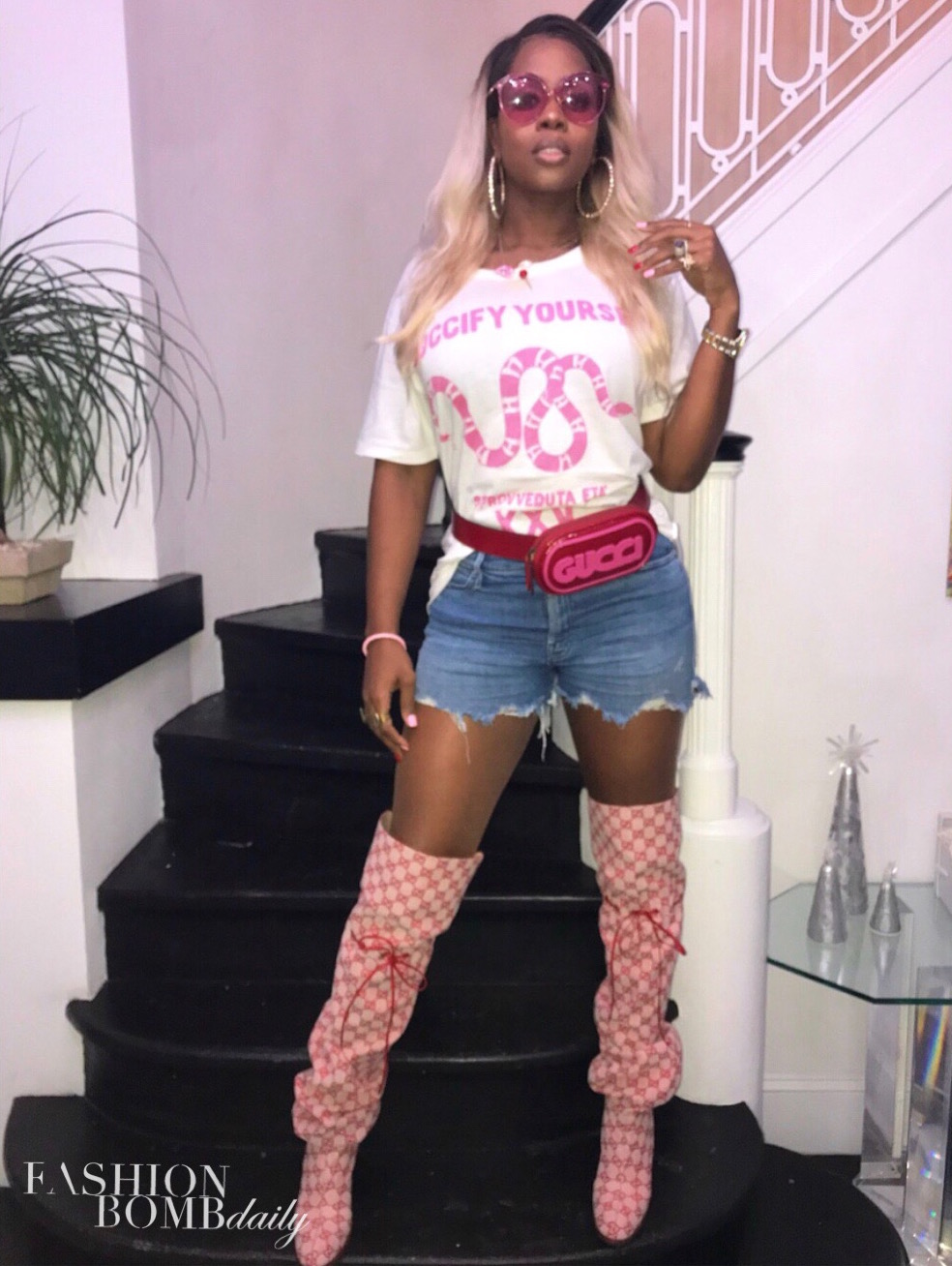 Remy Ma looked ready for the festivities for a recent photoshoot in a $620 Gucci Guccify Yourself Tee, jean shorts, a fanny pack, and $1,790 Monogram over the knee boots:
