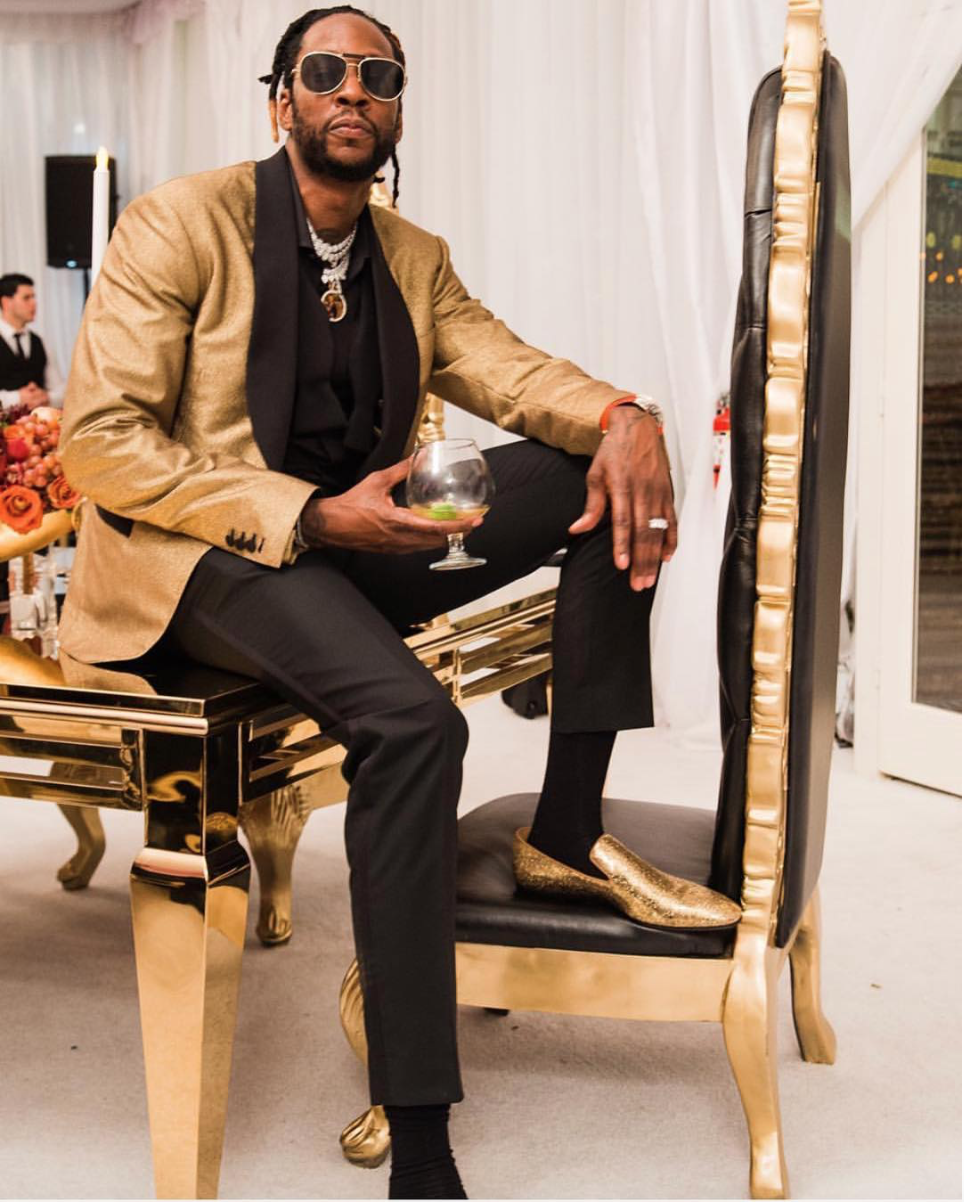 Before their big day, 2 Chainz looked dapper in a custom David Lance suit. That gold is bomb!
