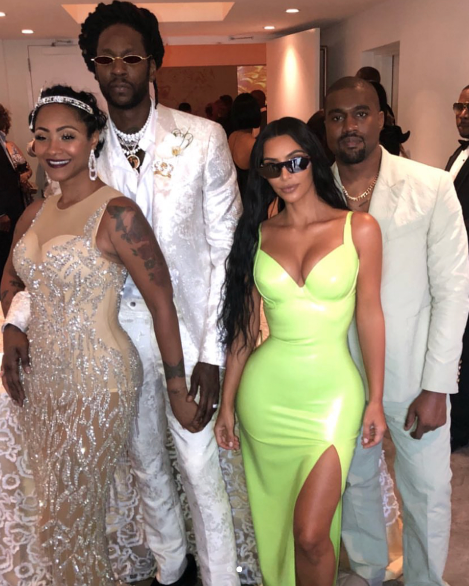 Guests like Monica, Kim Kardashian, and Kanye West were by the couple’s side to watch them wed. Monica wore a gold Delor Designs one shoulder dress, Kanye wore a Louis Vuitton suit, and Kim showed off her curves in an Atsuko Kudo latex dress.