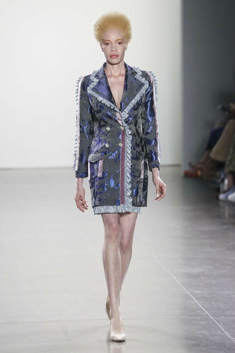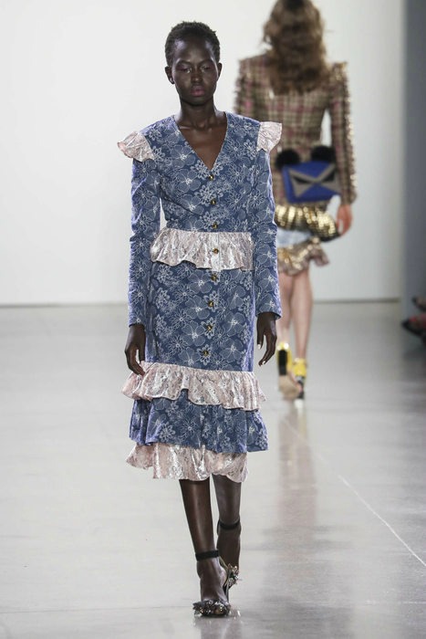 Designed with a heavy mix of contrasting prints and fabrics, Hu also incorporates her signature structured menswear blazers but gives them a softer, fantastical touch. The blazers add a balance of subtle masculinity against the fancy frills and fabrics.