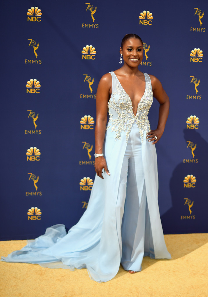 Ms. Issa did not come to play this year at the Emmy’s! The Emmy nominated actress graced the carpet in a baby blue Vera Wang jumpsuit. The plunging neck ensemble featured 3,000 hand appliquéd crystals and a beautiful train. Issa looked gorgeous with her hair pulled back, a style we don’t see much from her. Hot!