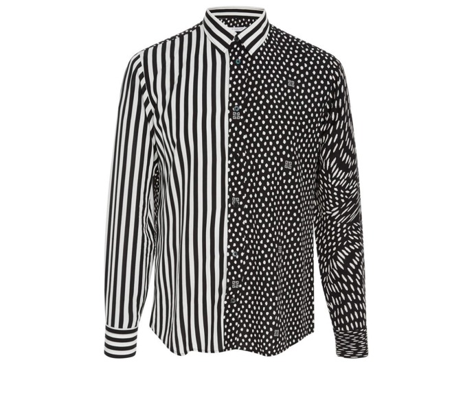 The crepe button up on shirt is patterned with stripes and monogrommed polka dots creating a mixed media effect.