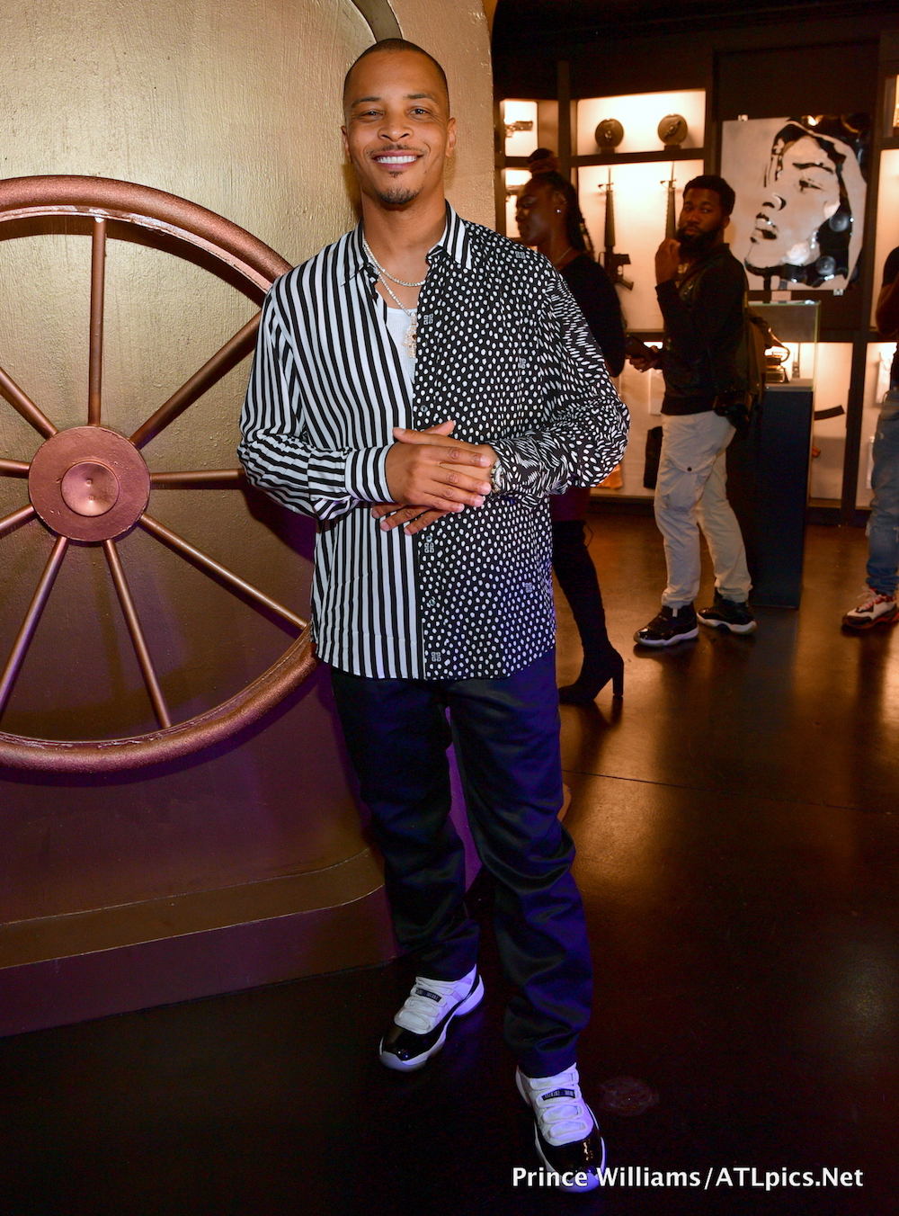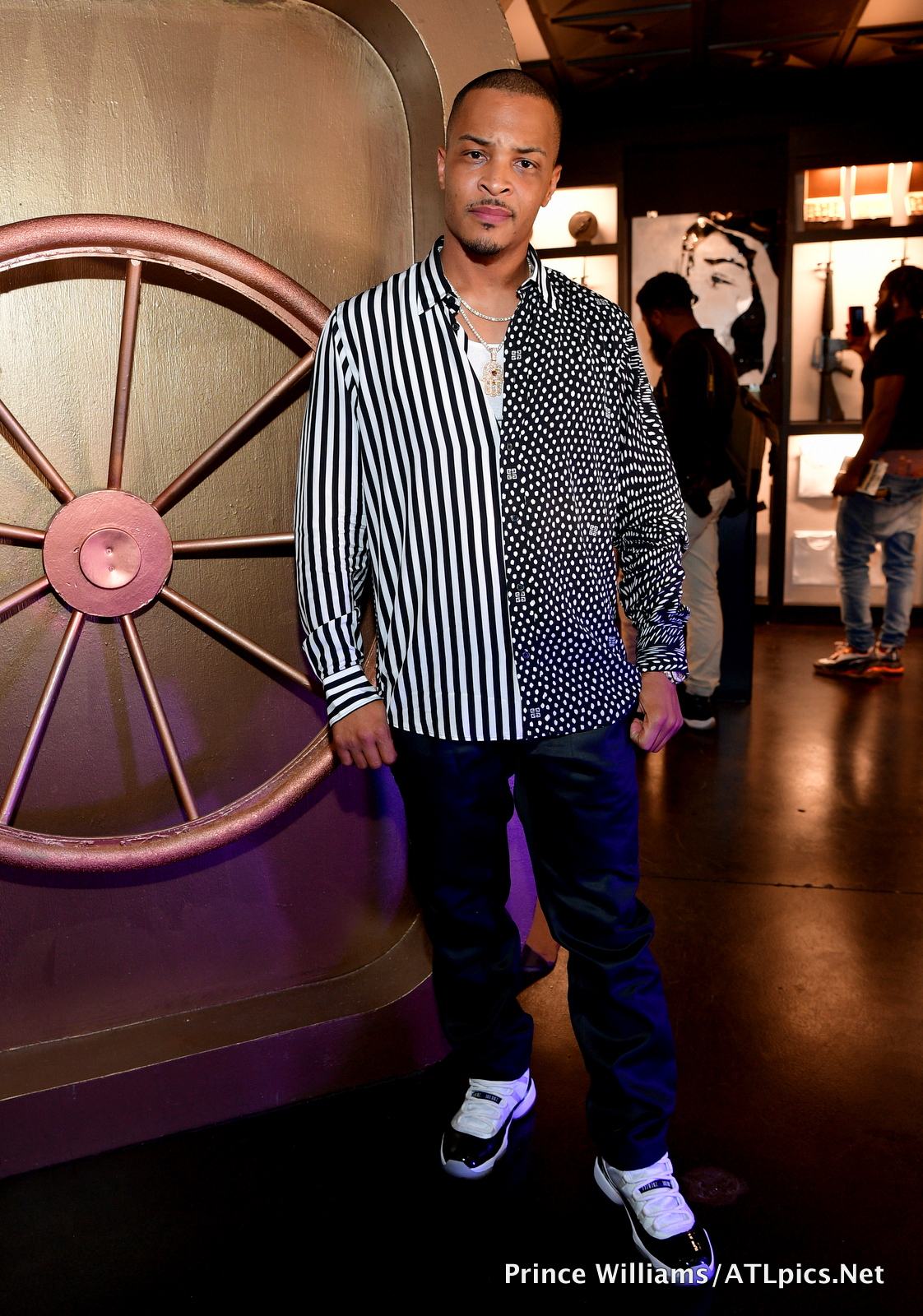 T.I. attended his album release party at the Trap Museum wearing the same $890 Givenchy Striped and Dotted button down shirt Joe Budden wore for a date night with Cyn Santana.