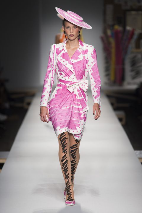 The pink and white printed dress had polka dots and a scribbling detail with a bow cinching her waist. Cardi’s love of statement hats shined through with this look as she rocked a black and white hat with a similar print as the dress. The scribbled look continued onto her nude tights.