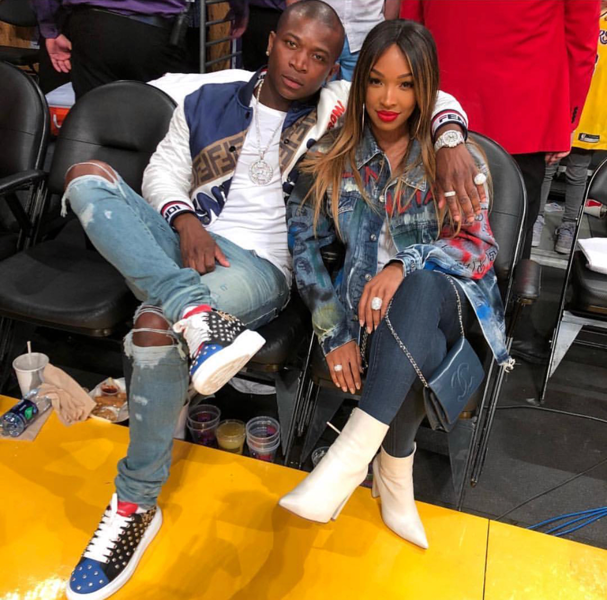 Ot Genasis kicked it with girlfriend Malika Haqq at a recent game in a Fendi x Fila jacket.