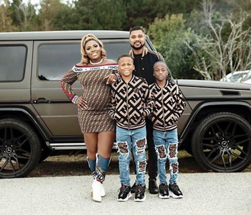 Another big logo lover, Premadonna, wears Fendi all the time, but recently announced her pregnancy wearing a $1,790 Fendi x Fila short dress and $1,790 Cowboy boots by the brand. Her whole family matched with her to the tee, with her sons and husband in Fendi jackets with jeans featuring peekaboos of Fendi fabric.