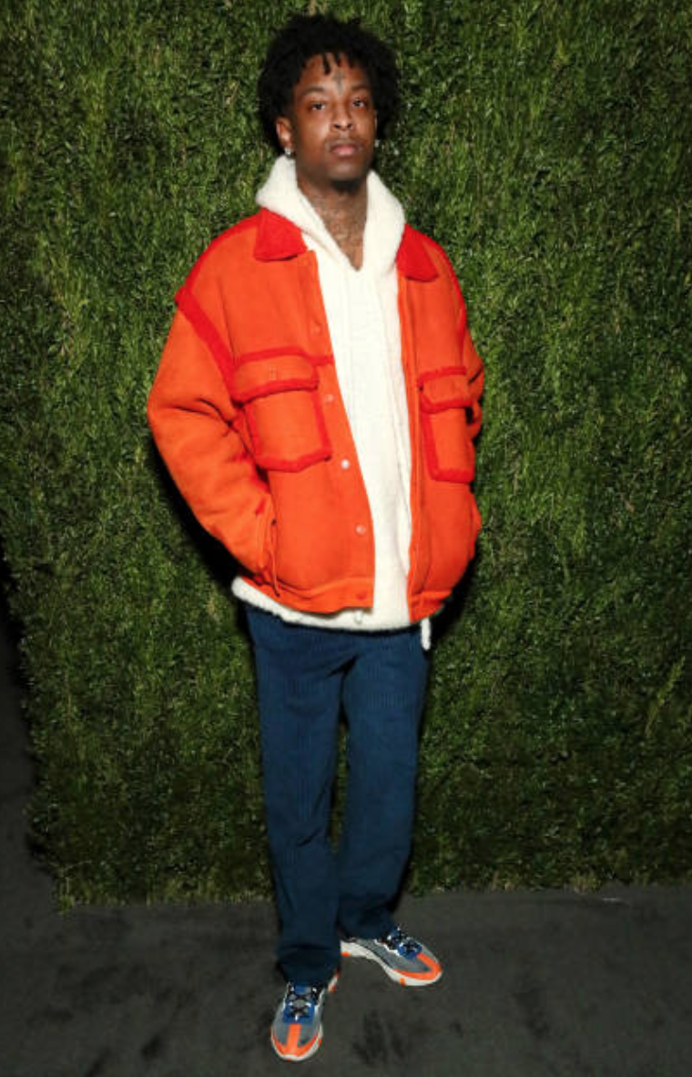 21 Savage represented for the Fashion Bomb men wearing a full Rochambeau shearling lined orange coat and pants.