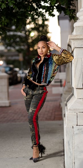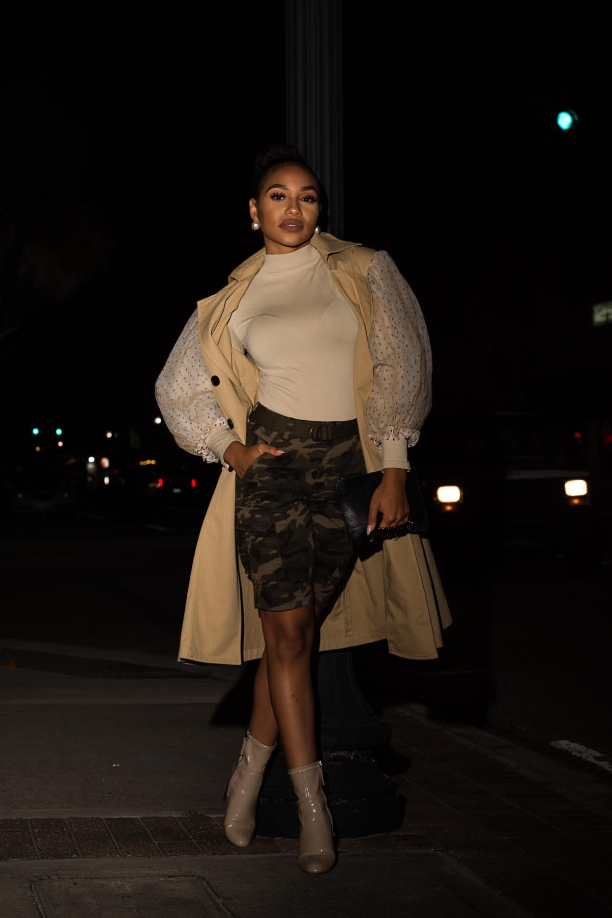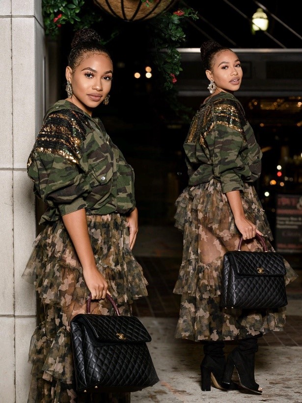 It’s really about mixing and matching with the right pieces to feminize the look. The key question to drive your camo styling is “How do I make this look feminine and give it lady like direction?” A feminine approach can include pairing your camo piece with ruffles, sequin, chiffon, a stylish coat, or a sexy heel.