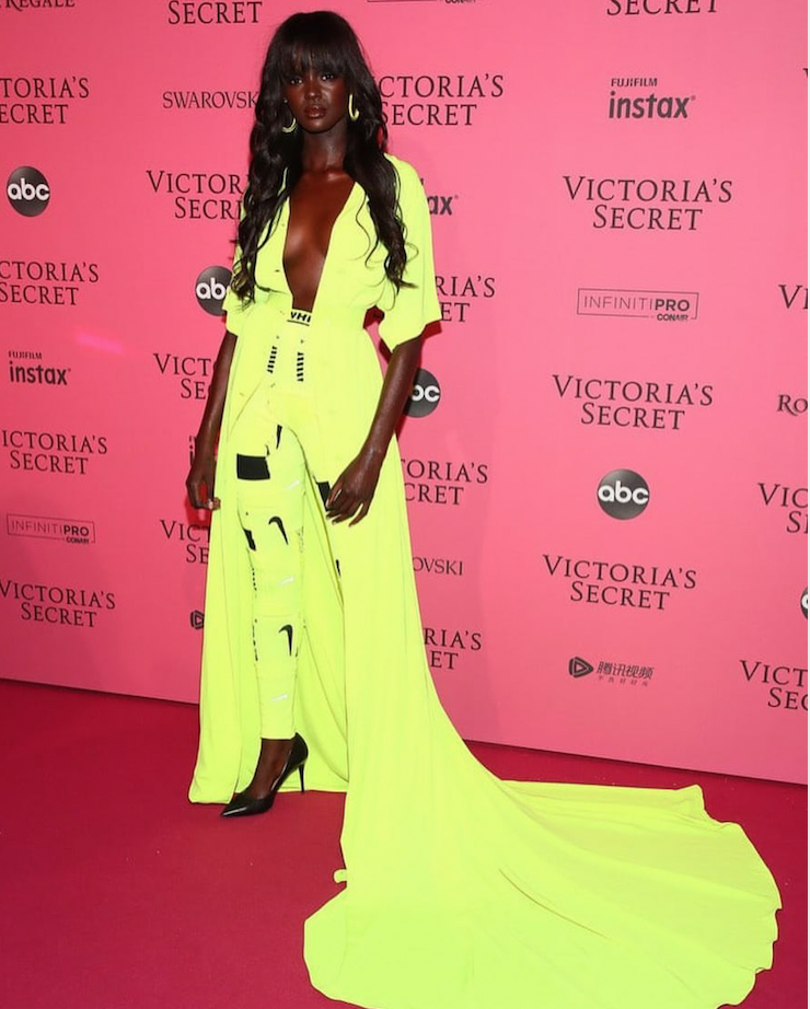 Duckie Thot tried her hand at the neon trend rocking a Off White look. How amazing does this color look on her skin?!