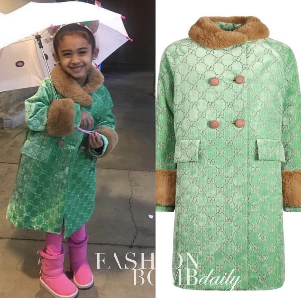 Representing for @fashionbombkids, the adorable Royalty Brown smiled bright in a $1,873 Gucci Girls “GG” Velvet Coat in Green with Faux fur!