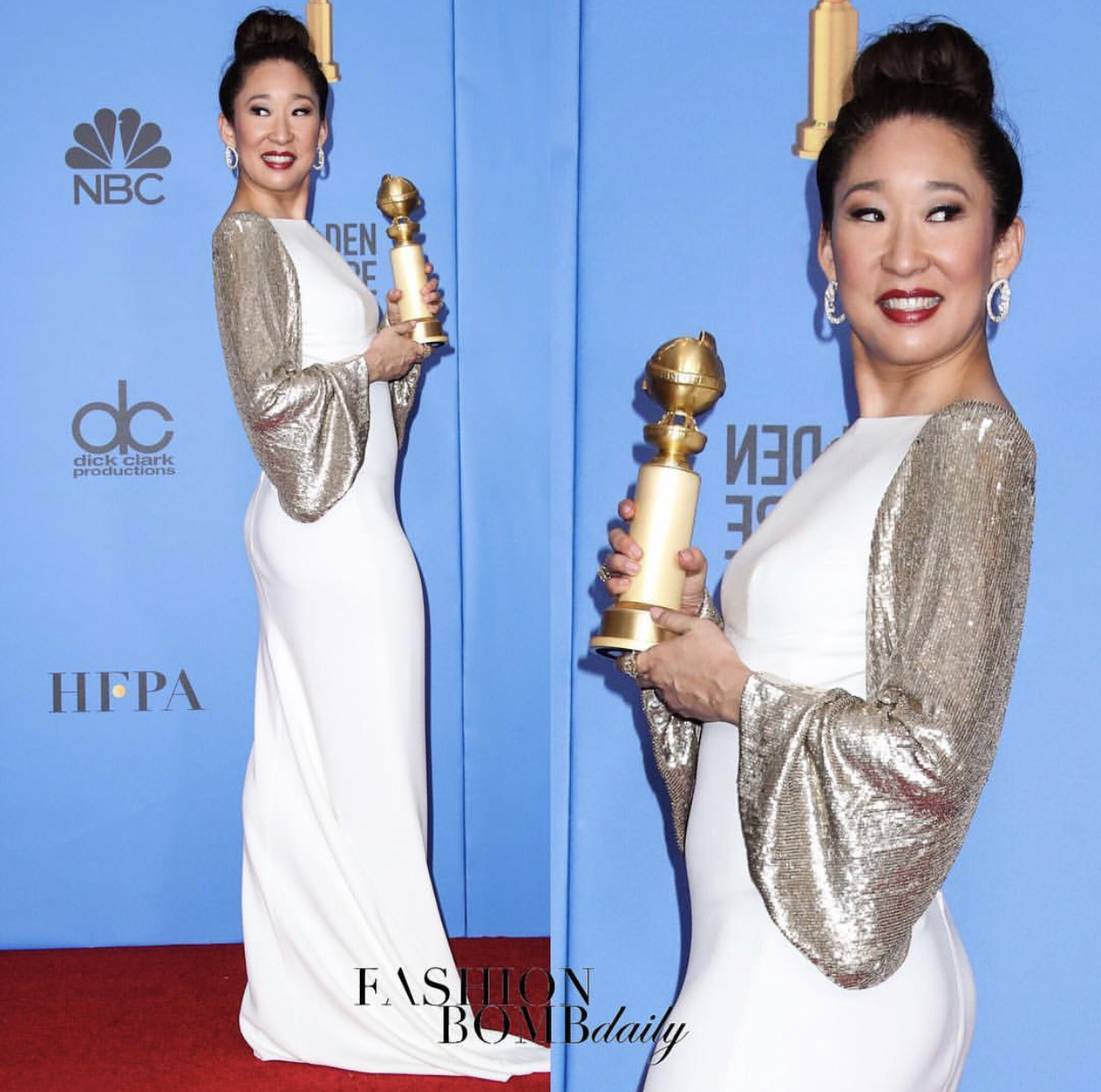 Sandra Oh wearing a Stella McCartney gown to the 2019 Golden Globes