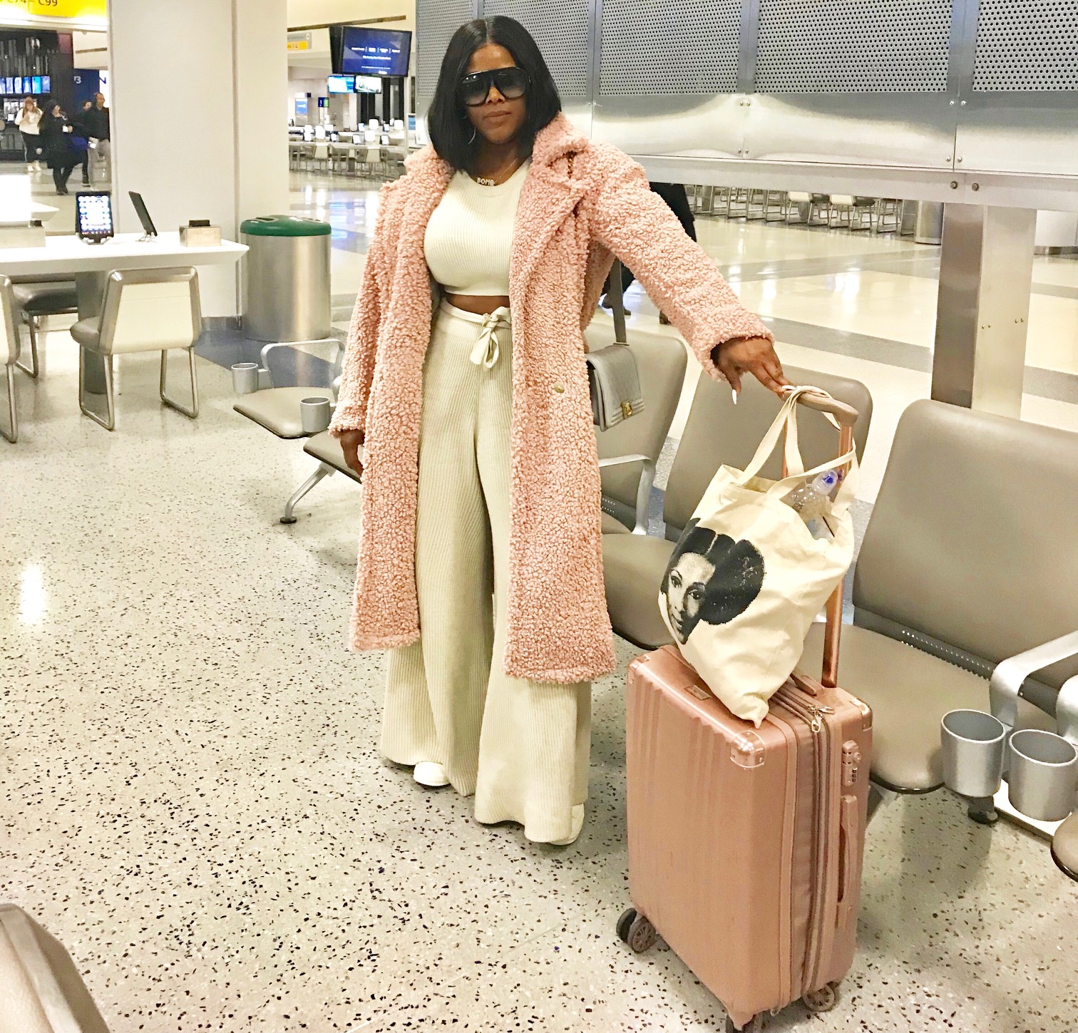 I just flew back from sunny LA to cold New York! For the almost 5 hour flight, I opted for a chic and comfortable look from House of CB comprised of their Mckenzie Oatmeal Ribbed top and pants and Bear “Blush” faux sherpa coat: