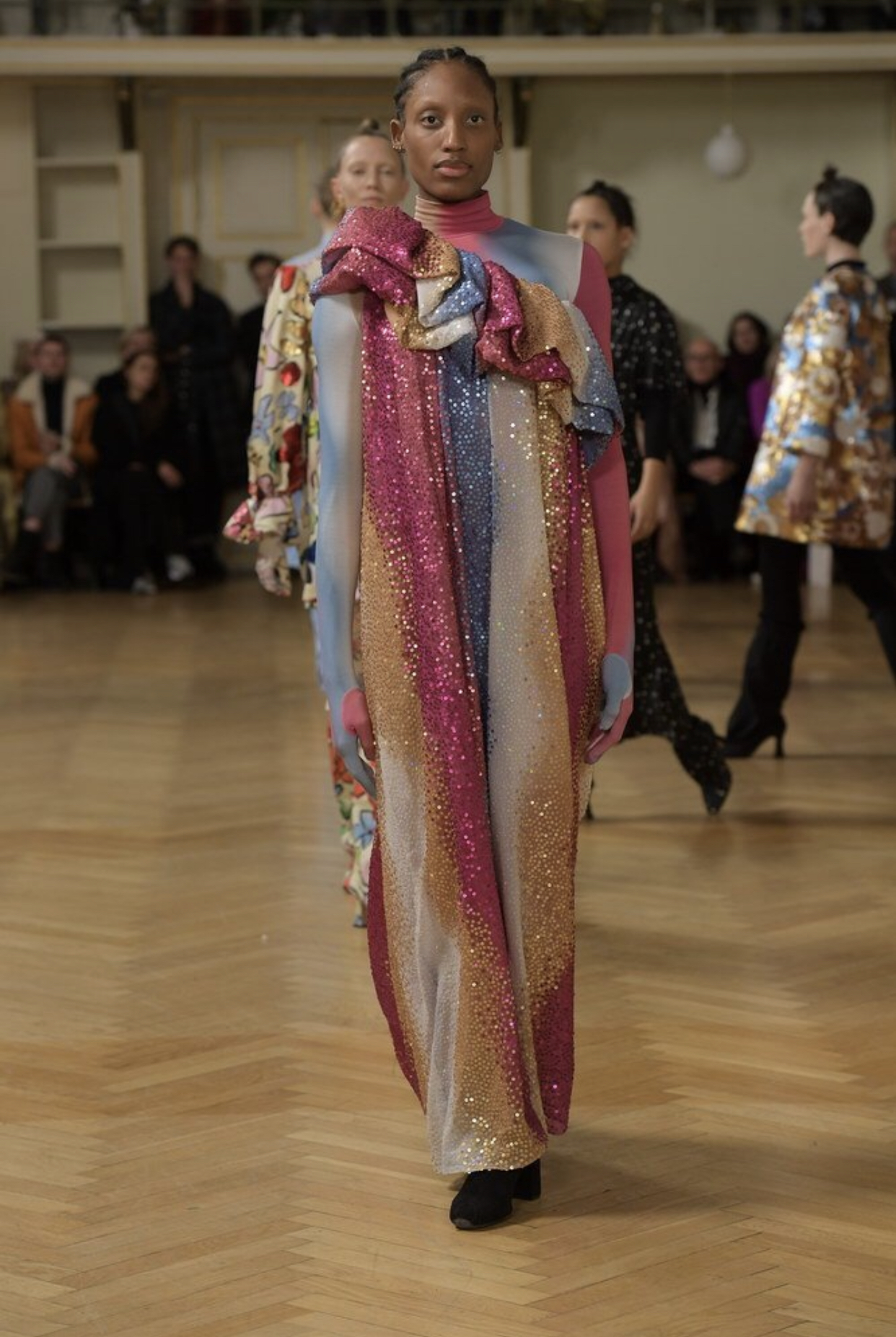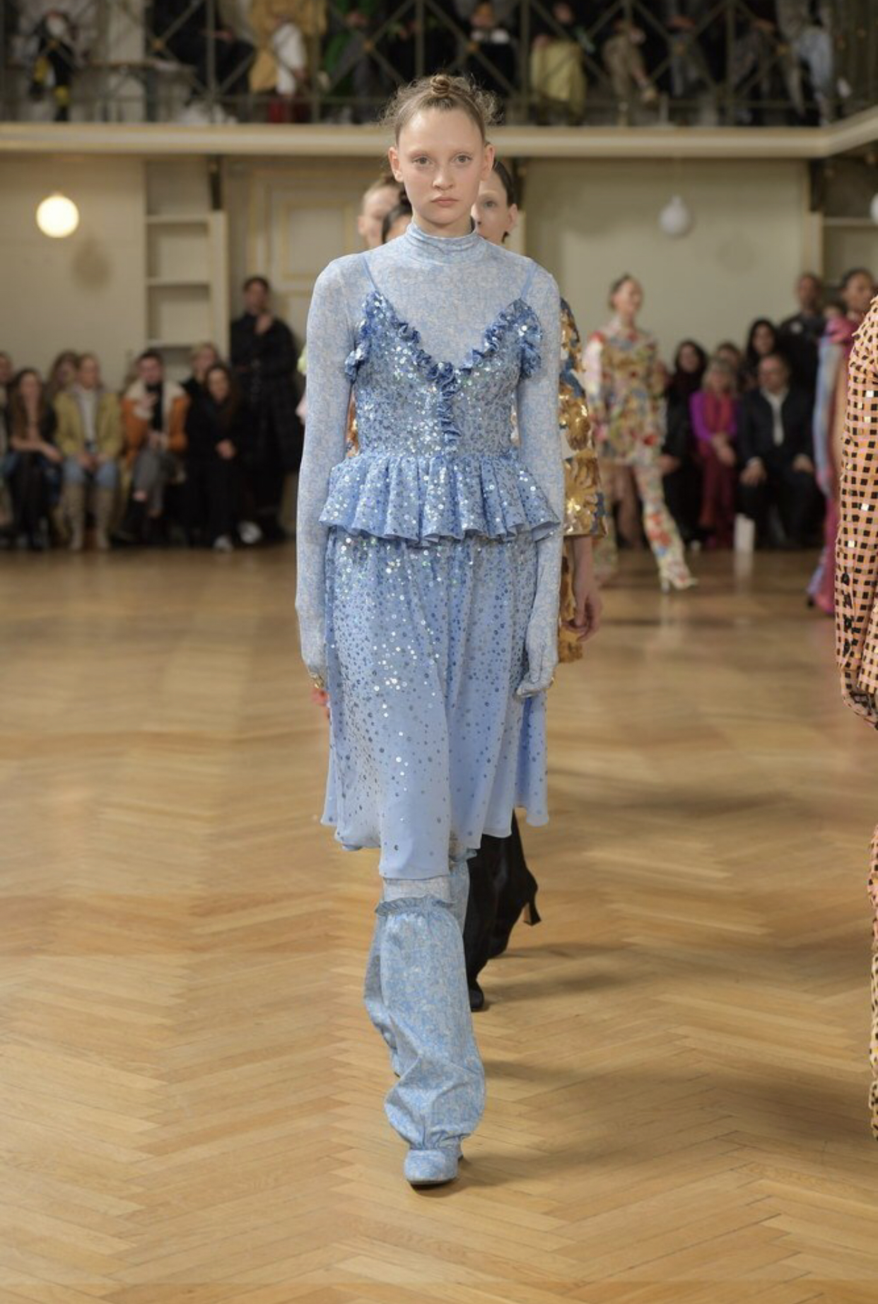 Based in Copenhagen, Stine Goya focuses on the frills and fun of femininity which is expressed through eclectic prints and design ways. Stine Goya’s AW19 elegant designs showcase feminine expression and empowerment through ruffles and peplum covered in sparkling glitter and polka dots.