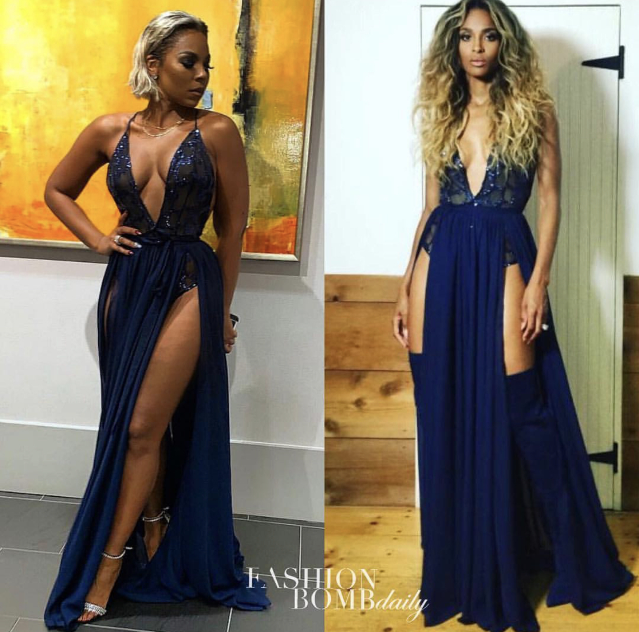 Ciara and Ashanti were both seen wearing this navy Michael Costello dress. Who wore it best?