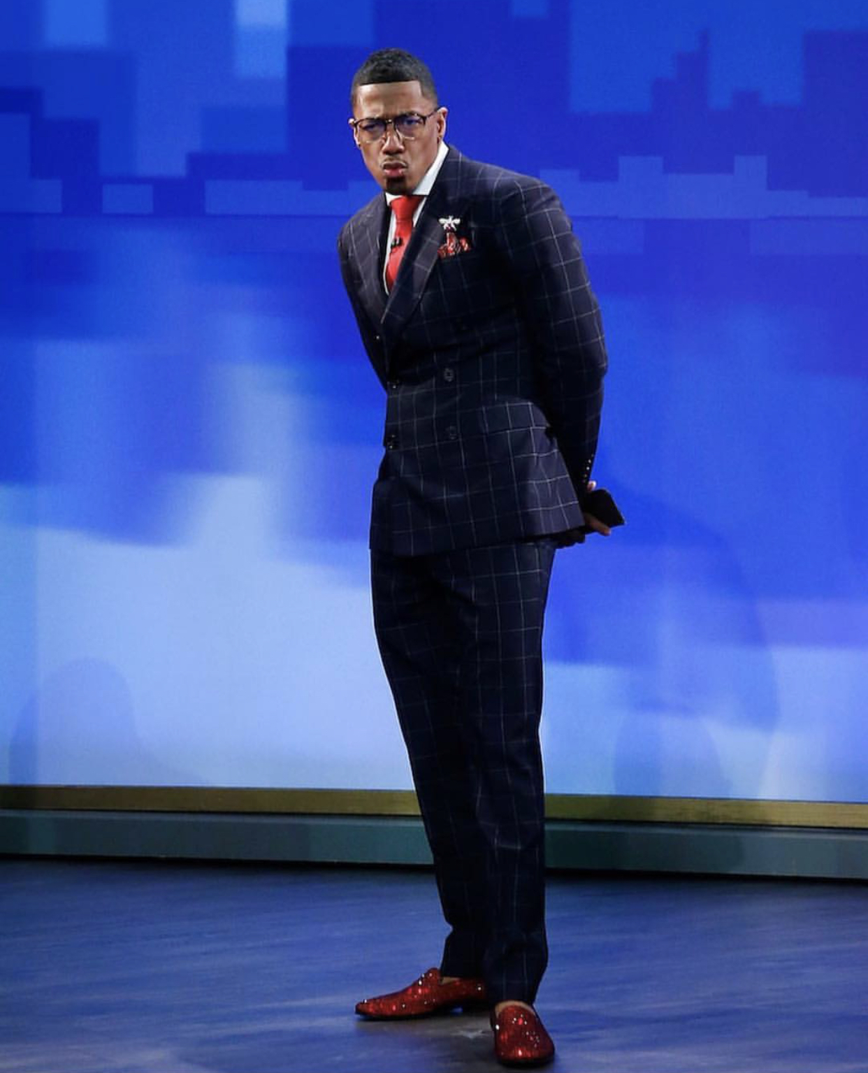 Nick Cannon was spotted looking sharp as the Wendy Williams show host in a Ralph Lauren suit and Tom Ford glasses along with a Patek Phillippe watch and Louboutin slippers.