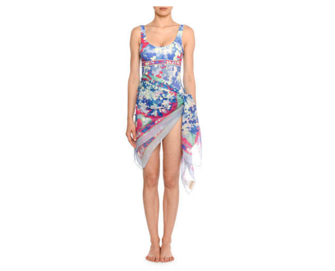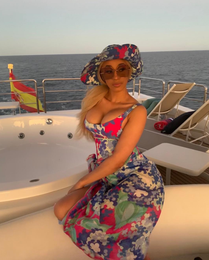 Cardi B is living the Bomb Life! The rapper relaxed on vacation with hubby offset wearing a $520 Emilio Pucci Blue and Pink Camo Hydrangea Printed One Piece Swimsuit, $320 Cover Up, and $350 Beach Hat: