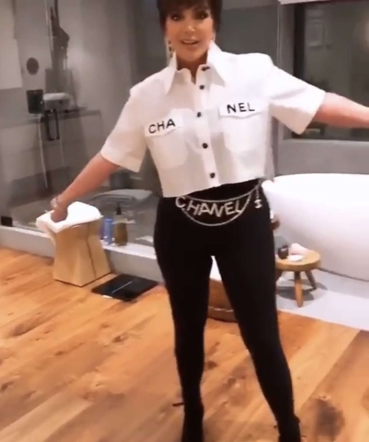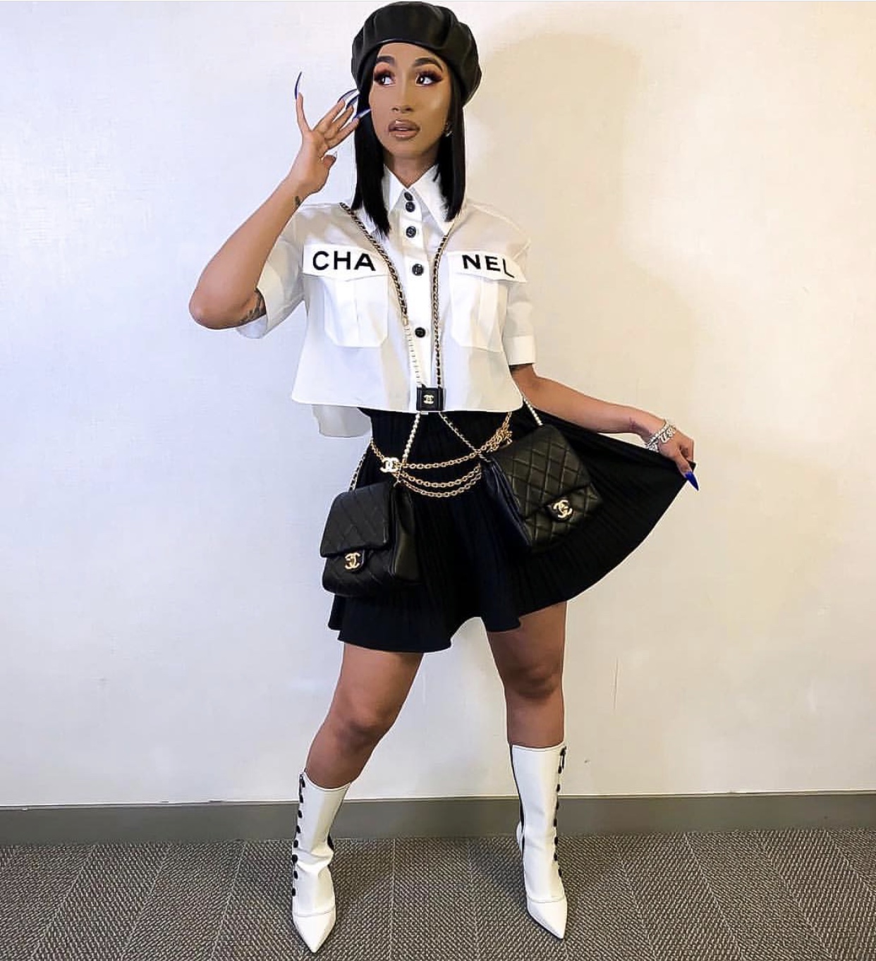 Cardi B posed for a stylish pic in Chanel’s trending white button-up blouse while Kris Jenner uploaded a candid video of herself modeling the top. Both ladies paired their ensembles with Chanel chain belts, however, Cardi opted for a Black Leather Beret, Pleated Black Skirt with White Boots while Kris went with Black Skinny Jeans and Black Boots for a monochromatic look.