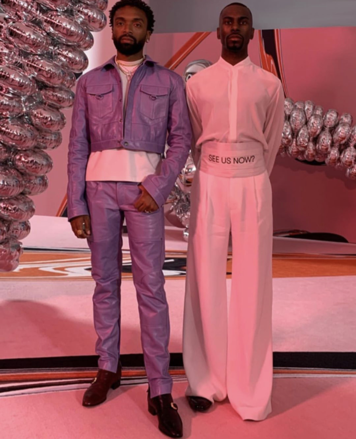 Activist DeRay McKesson posed with Kerby-Jean Raymond wearing a bomb Pyer Moss outfit with a statement waistband.