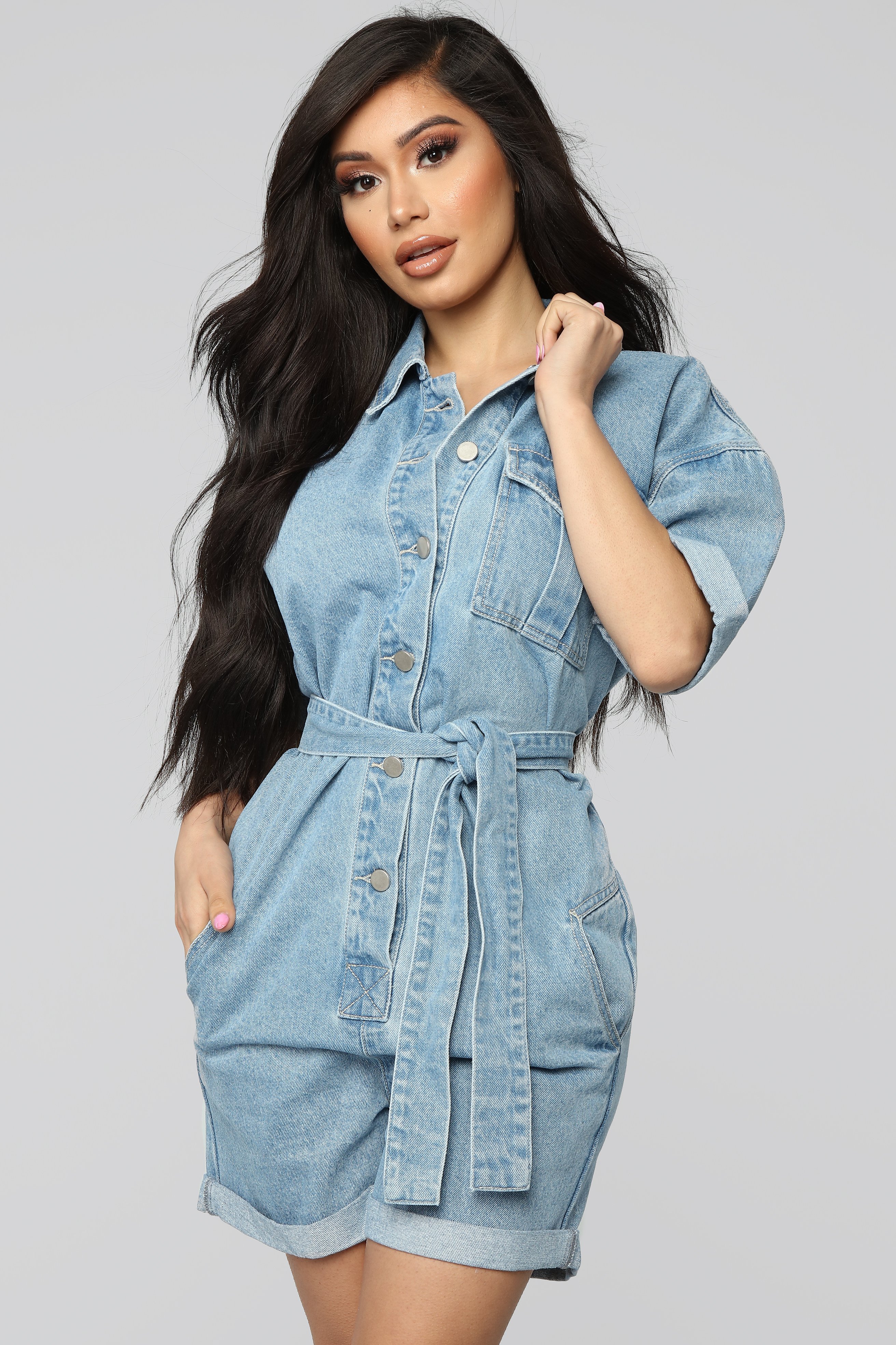 “The Whole Package Denim Romper” is available on the Fashion Nova site for the price of $49.99! This light wash denim romper is 100% cotton, so it provides comfort and breathability for that summer heat. It appears to be slightly oversized for those who like a baggy feel to their denim pieces, I recommend sizing up for a more oversized look. Set the look off with a pair of neon heels and some sunglasses for a day out on the town or your local day party .