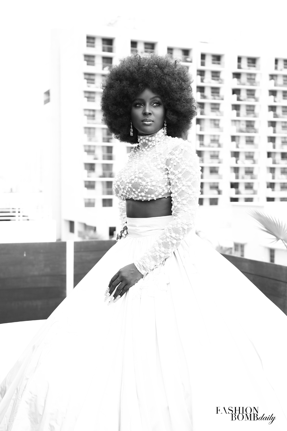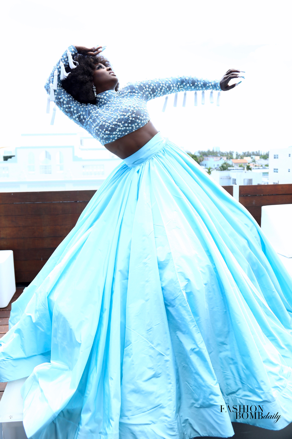 She strutted onto the white washed rooftop, twisting her hips to the music playing over the speakers, and pausing to smile in selfies with adoring fans. She was quick and her boldness was boundless. Hop onto a ledge and face the sun? Sure. Walk in vertiginous glittery heels? You got it. Put on a swimsuit? No problem. Amara explained, “I started as a child star at a very early age. [At] 4 years old, [I was] working at a major Latin network called Univision. I grew up watching amazing artists– watching how they work. I try to be as flexible as possible when it comes to working. I try not to say no. I find a solution at the end of the day, and always [come] extra prepared. If that means bringing extra accessories, leggings, stockings, whatever that needs to be done so that I accomplish my mission, I will do that.”