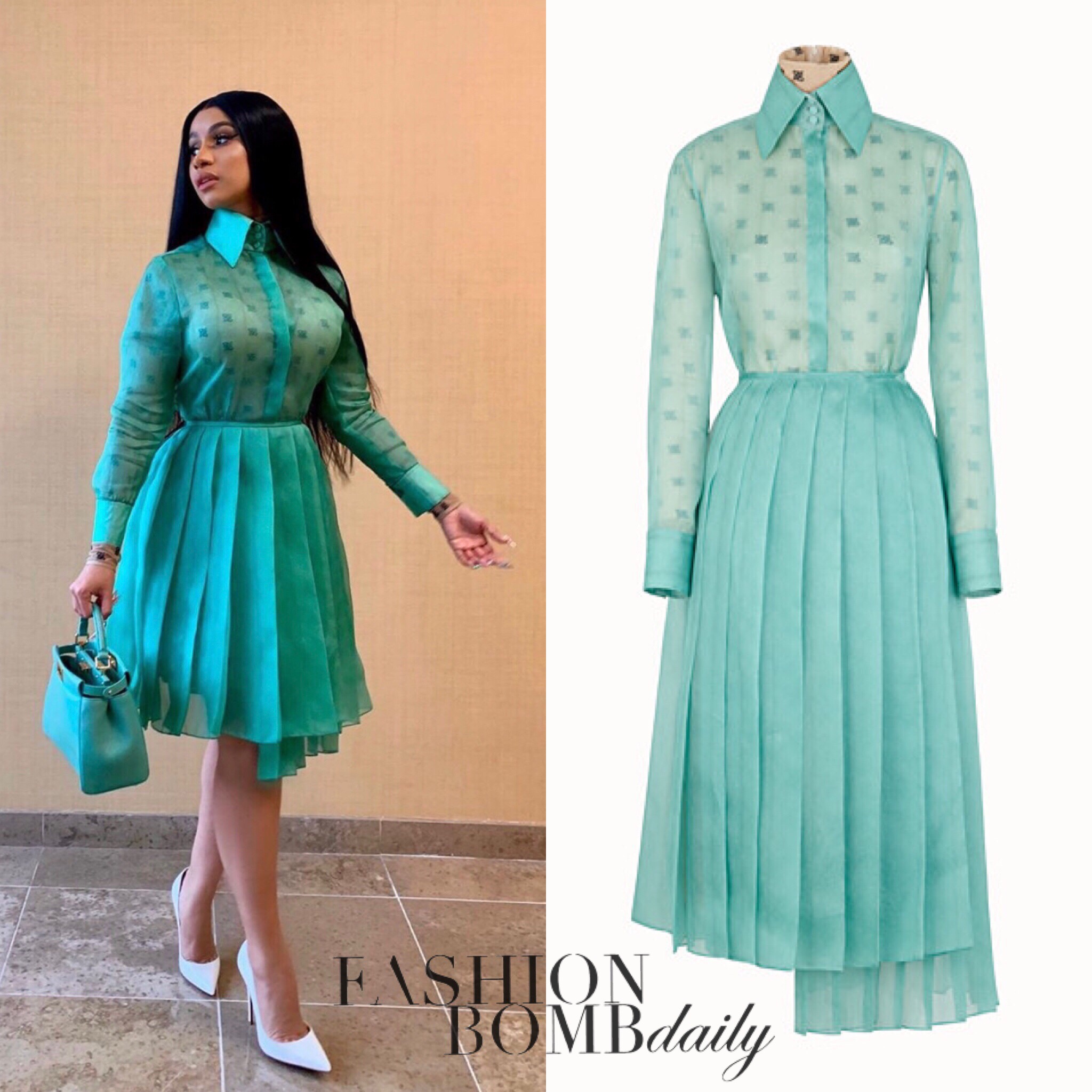 Styled by Kollin Carter, Cardi sat down to discuss politics in an aqua green $5,100 Fendi organza dress paired with a Fendi Peekaboo Iconic Mini bag in a matching aqua green. The look was complete with an all white pair of $695 Christian Louboutin “So Kate” pumps. What a chic yet classy look for politicking!