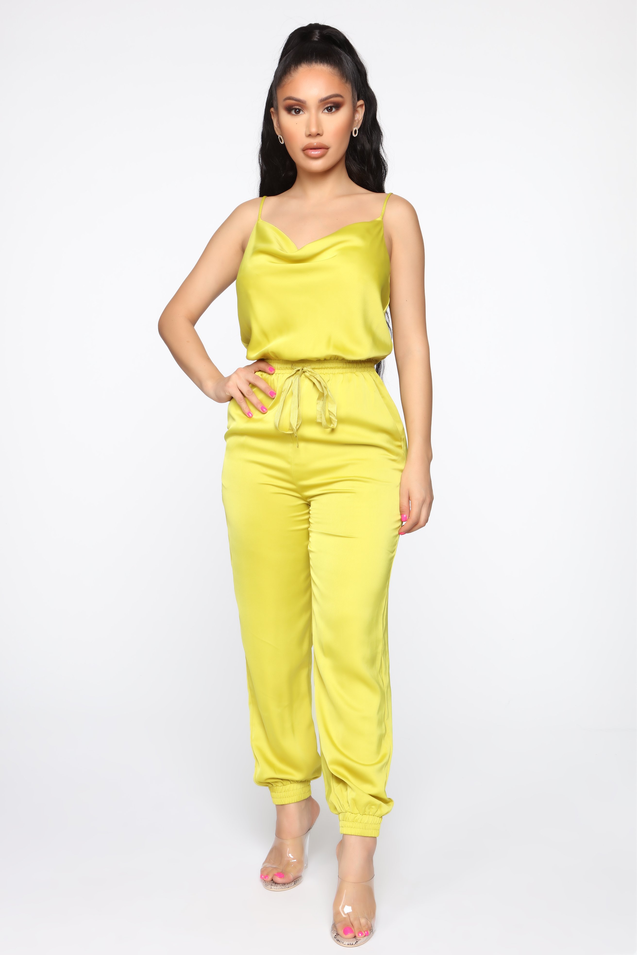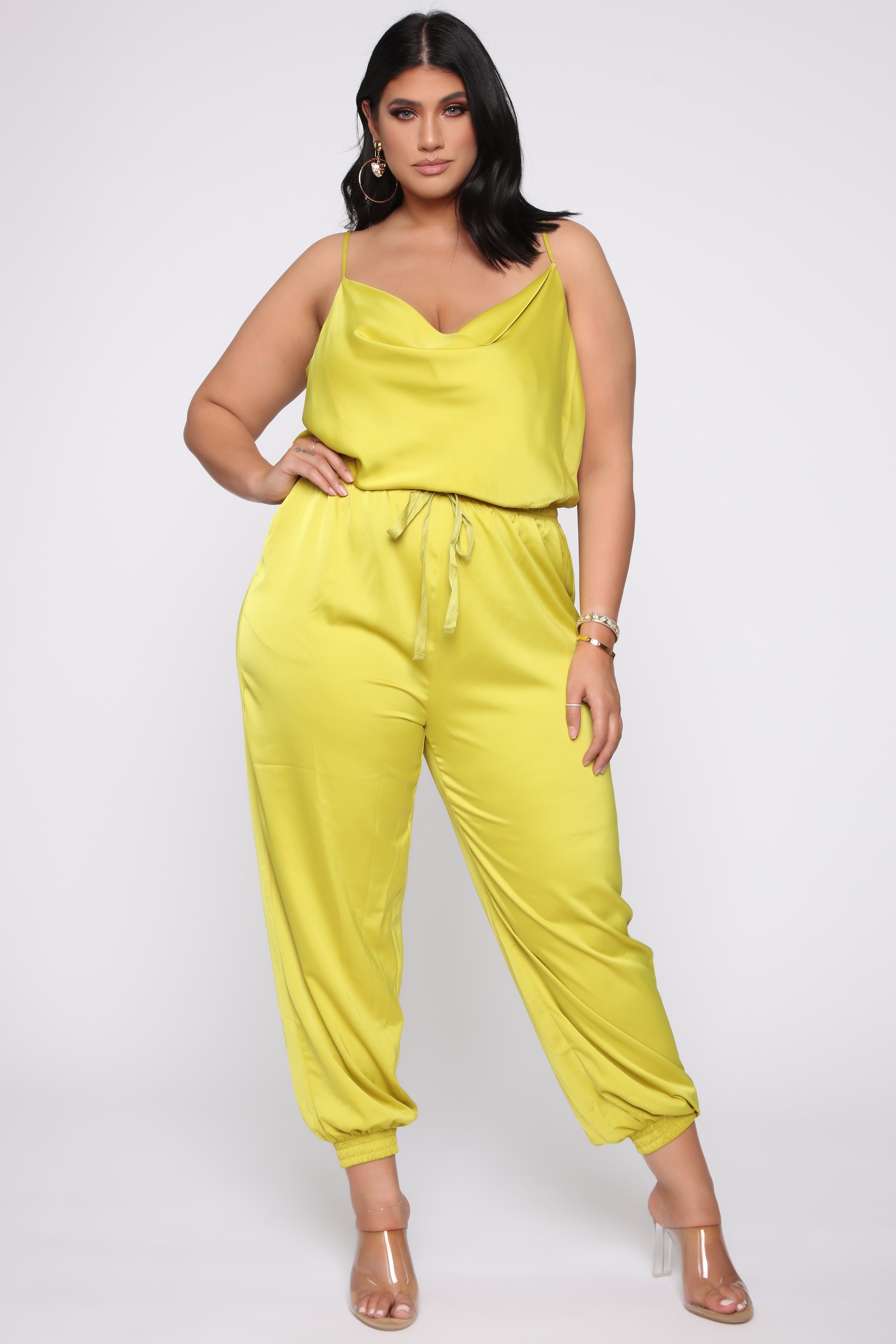 Toya Wright sat pretty in Fashion Nova’s “Got It Going On” Satin Jumpsuit in lime green. The jumpsuit is also available in mauve and caters to our curvy Bombshells with sizes reaching up to 3X. This stylish piece is complete with a cowl neck, elastic waist for extra comfort, and a jogger pant style for the bottom. Stand out wherever you go in this jumpsuit for just $34.99!