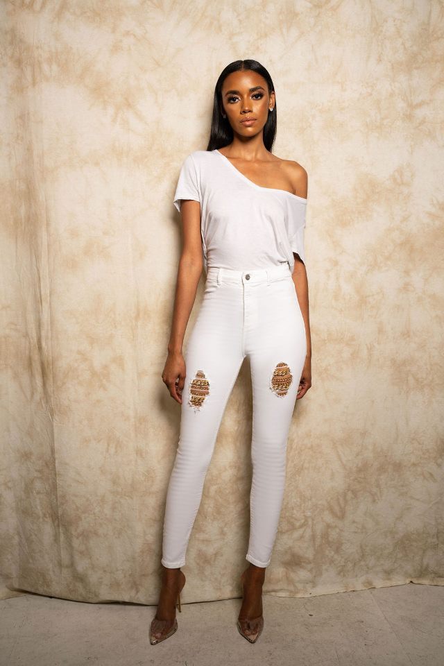 If there’s nothing we can appreciate more than a Bomb Product to rock in fashion, it’s how versatile an outfit can be made with the same piece! For a special shoot with our Bombshell of a model Dajah Dorn, we showed three ways on how to wear these white distressed Rayar ‘Billionaire Jeans’! Get in to it below.