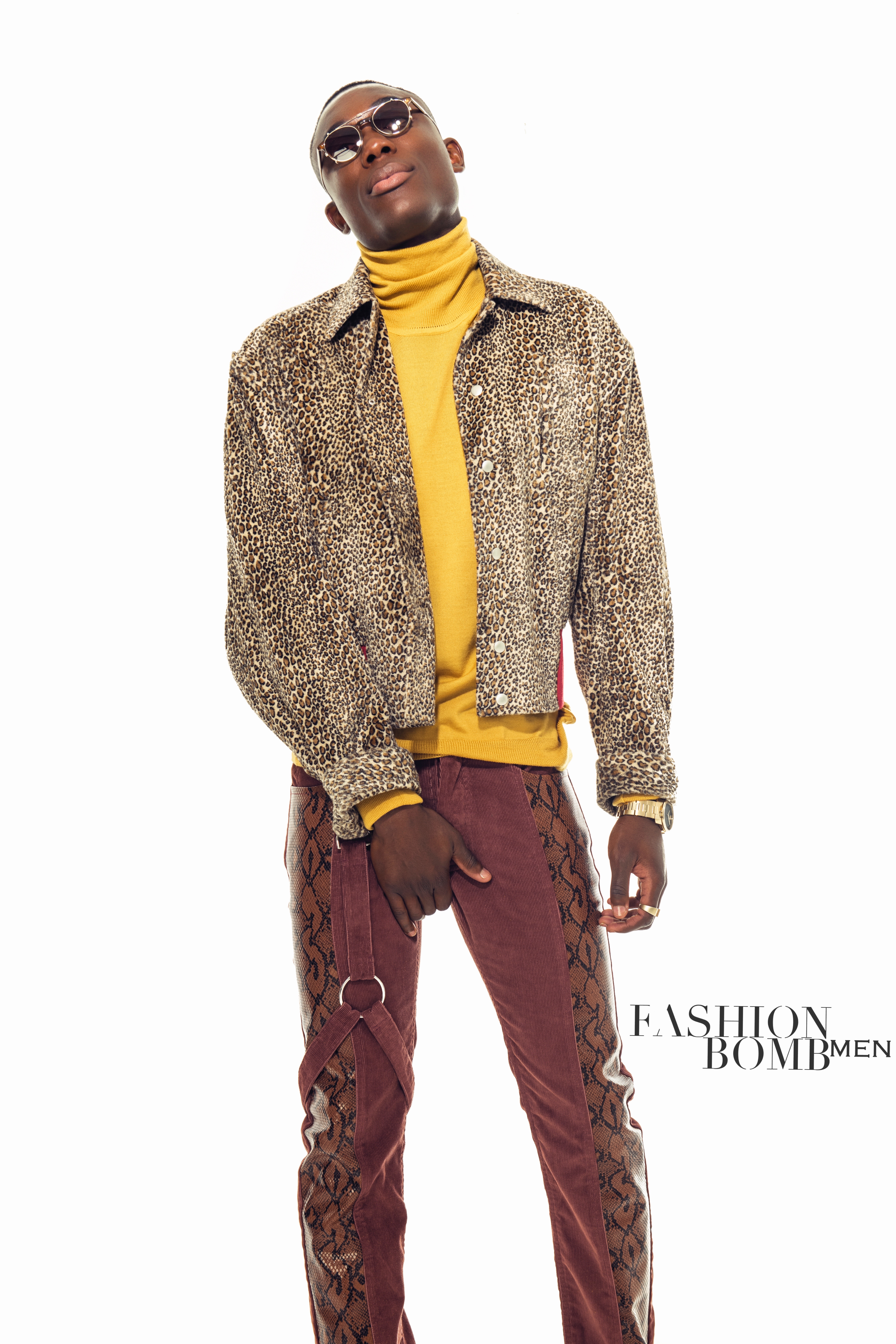 He continues, “This new men’s feature that Claire blessed me with the chance to create is a dedication to dark-skin Black men, who often times get overlooked by the industry. I wanted to take all the Fall/Winter ‘19 men’s runway trends and place them on a beautiful, male model so that the translation ‘from picture to reality’ could be more clear. When people see themselves in fashion, they’re more apt to participate and ultimately make a purchase, and that’s what we’ve done with this editorial- making the runway trends accessible via the FBD shop site. “